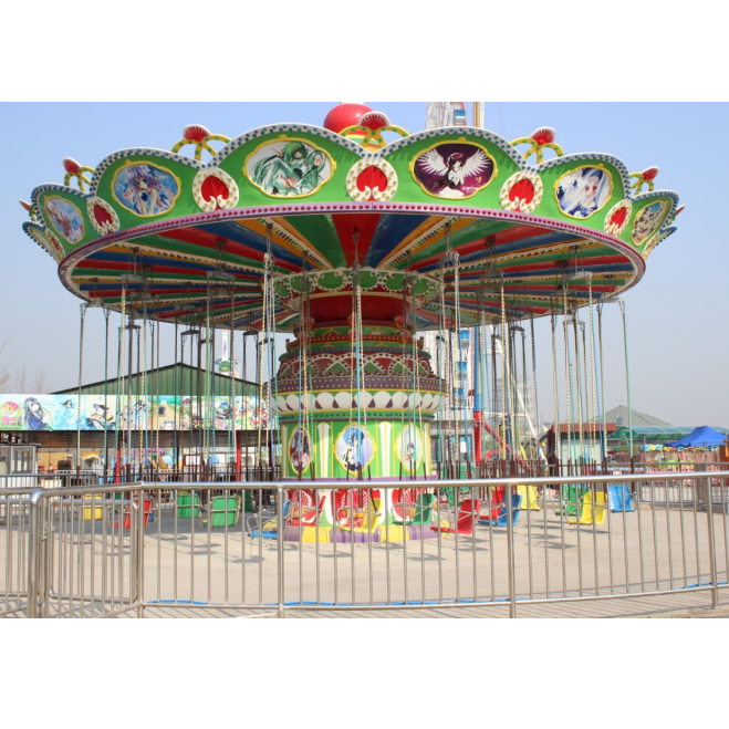 The swinging flying chair is a large-scale flying tower amusement machine that integrates various forms of movement such as rotation, lifting, and variable inclination. When the umbrella-shaped turntable and the middle turntable start to rotate in the opposite direction, the tower body rises slowly. At this time, the turntable swings, and visitors are as if flying and floating in the air, with a wide sky and a thrilling atmosphere. It has soft and gorgeous lighting, colorful pattern design, and a gorgeous shape. It is currently one of the most beautiful and attractive amusement machines on the playground.