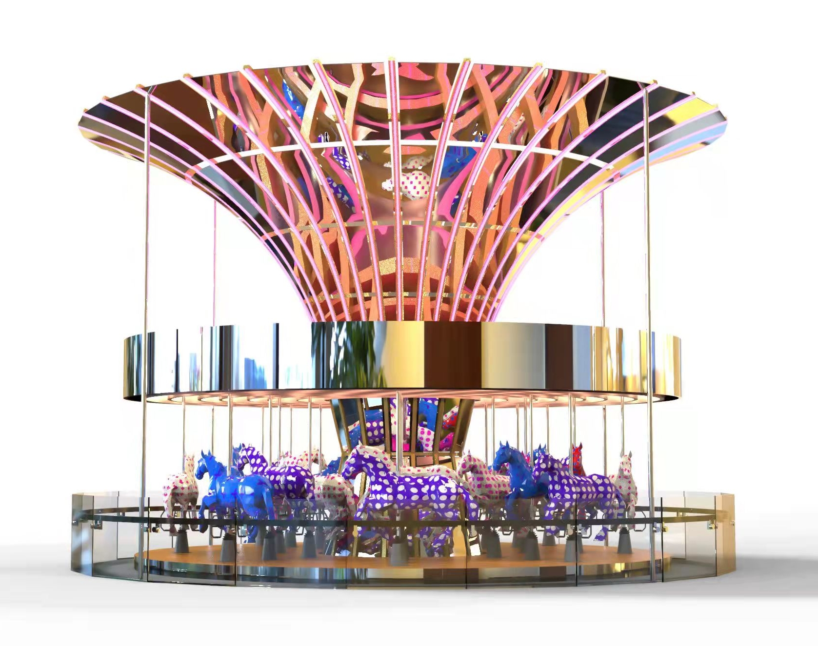 This Luxury Carousel amusement rides has a novel appearance and brilliant colors. It is very popular for teenagers. After it is started, the Luxury Carousel rotates at a constant speed, and the carousels of different shapes undulate up and down, giving the riders the feeling of riding the horse and galloping on the battlefield. This product is suitable for parks, playgrounds, children’s palaces, life squares, communities and other densely populated places. The main body is made of steel and the horses are made of glass fiber reinforced plastic. It has the characteristics of environmental protection, safety, corrosion resistance and good stability.